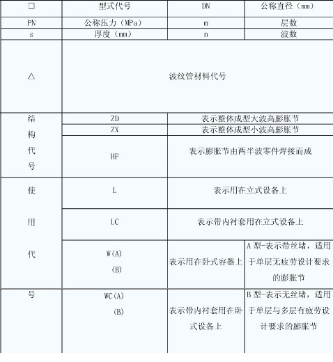 表示:公稱通徑為500mm,工作壓力為0.6MPa(6kg/cm2)波數為8個,不銹鋼管連接的軸向型外壓式波紋膨脹節。